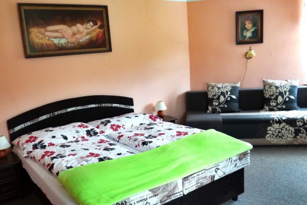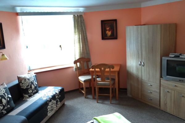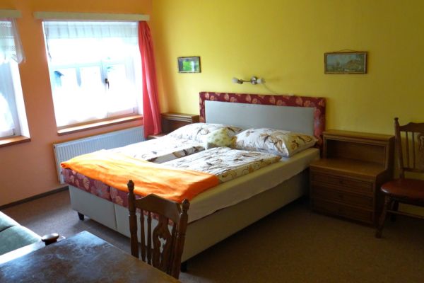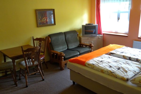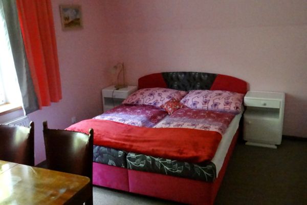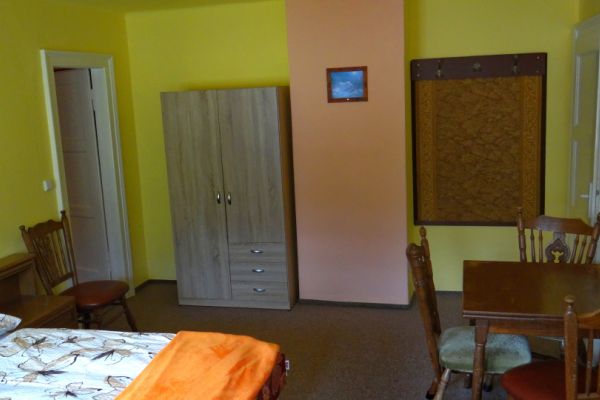 1. jednopokojový - 2 lůžkový pokoj s rozkládacím lůžkem pro 1-2 osoby (140x200cm) s vlastní koupelnou naproti pokoji (přes chodbičku)